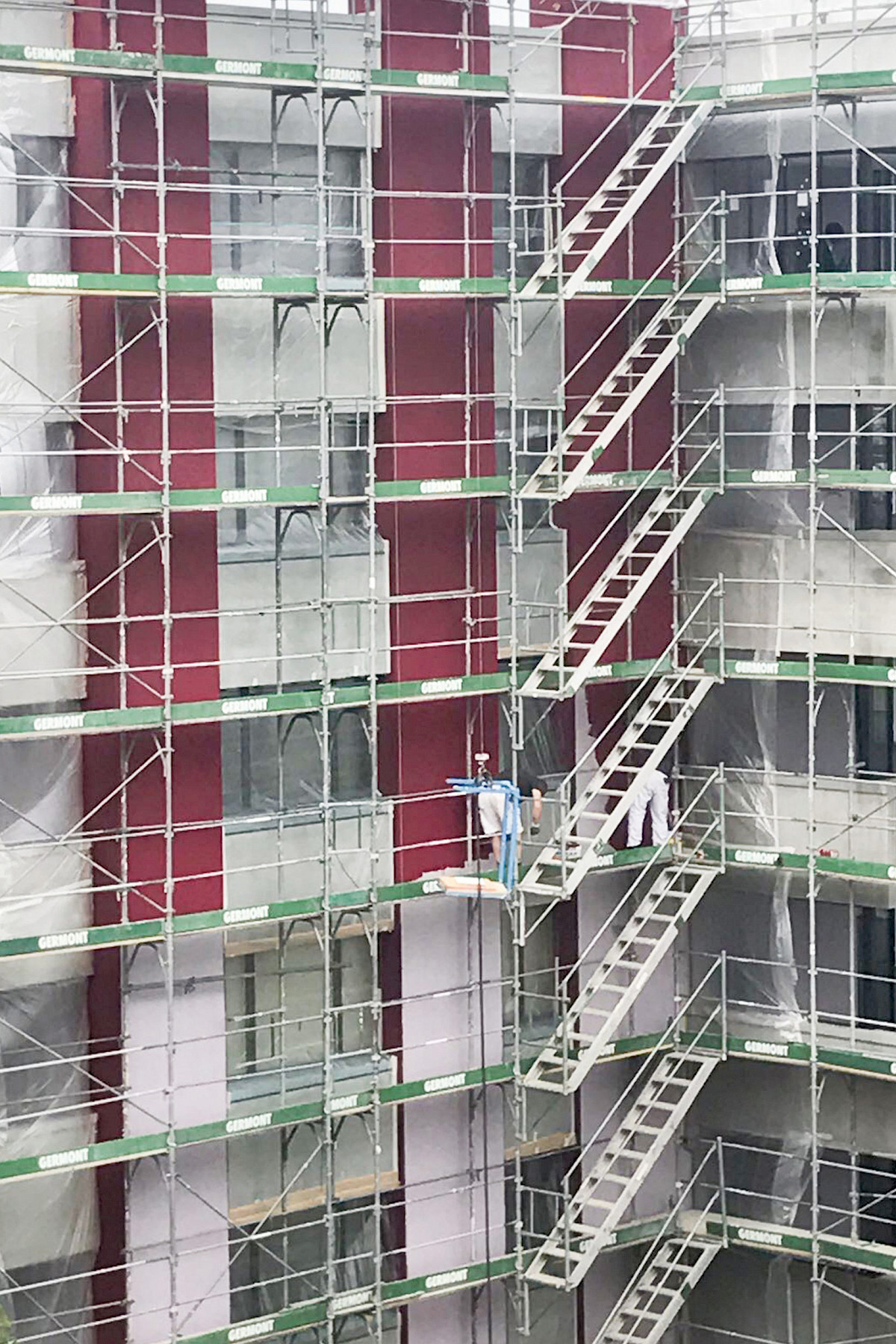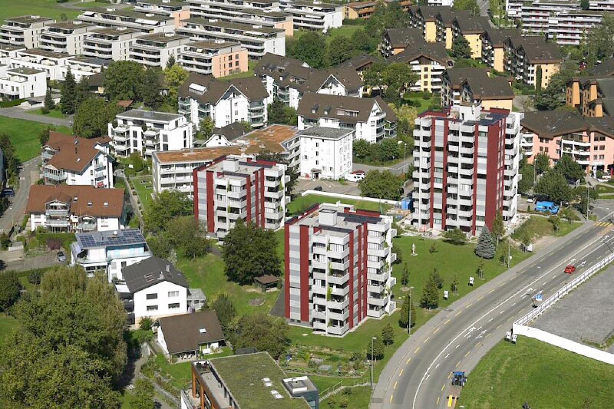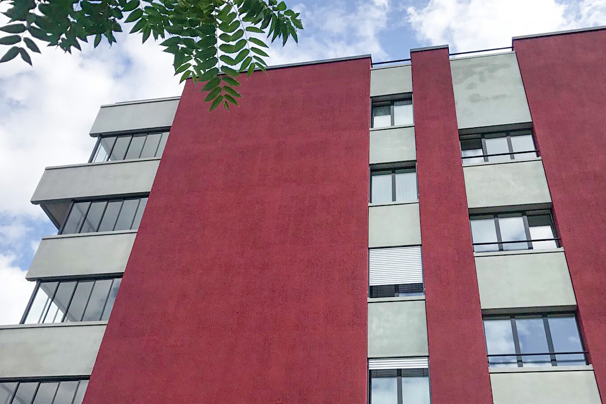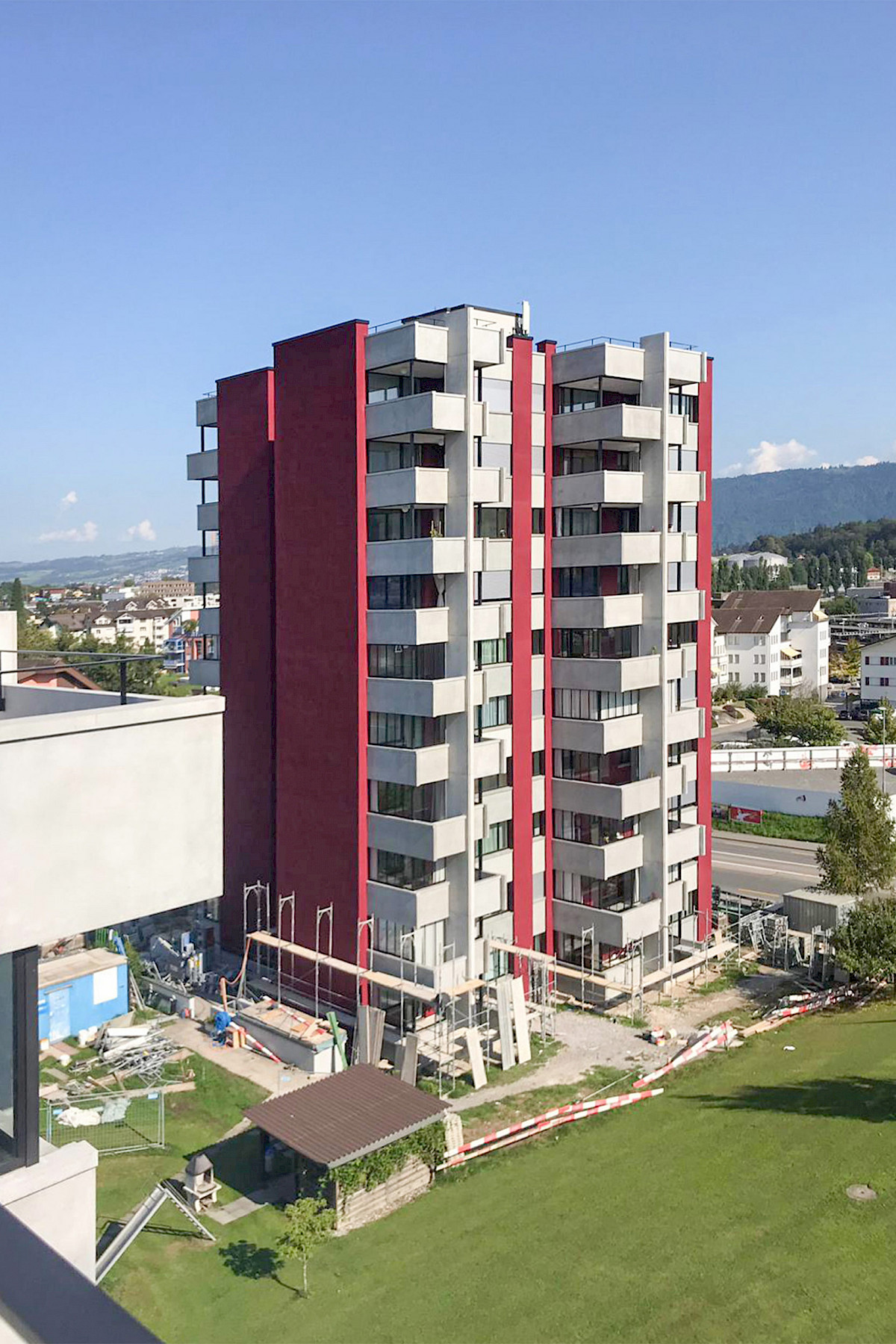 Die Fassaden der drei Hochhäuser wurden mit der MW-Eco 034, einer Mineralwoll-Dämmplatte mit einem deklarierten Lambda-Wert von 0.034 W/mK verkleidet. Die MW-Eco 034 besteht aus 80% Recyclingmaterial. Der Dämmstoff aus Glaswolle dient der Wärmedämmung, dem Schallschutz und dem vorbeugenden Brandschutz. Die Deckbeschichtung ist ein Vollabrieb 6.0 mm und wurde mit einer Strukturbürste vertikal bearbeitet.